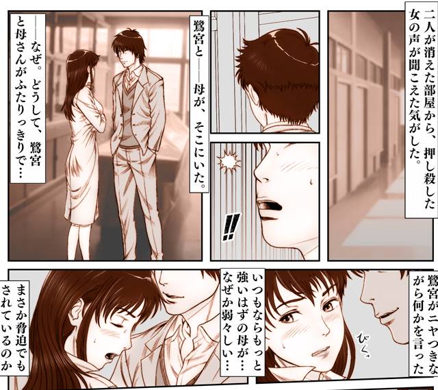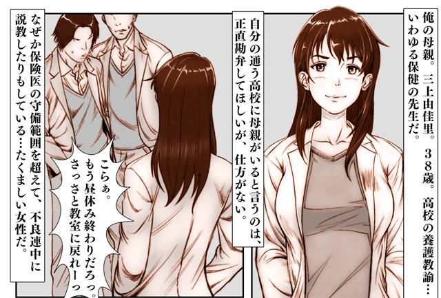 父が亡くなり、自分が通う高校の保険医として働く母親に育てられた息子。もちろん母親が大好きなんだけれども、クラスに転校生がやってきた日からどうにも様子がおかしい。心配する息子は、ある日、経口避妊薬を見つけてしまう。利用するのは母、ということは……男と中出しセックスしているという事。気になる息子、母親の様子も少し変だ、そしてついに母の痴態を目撃することになる。場所は学校の中、しかも相手はクラスメイトだった。