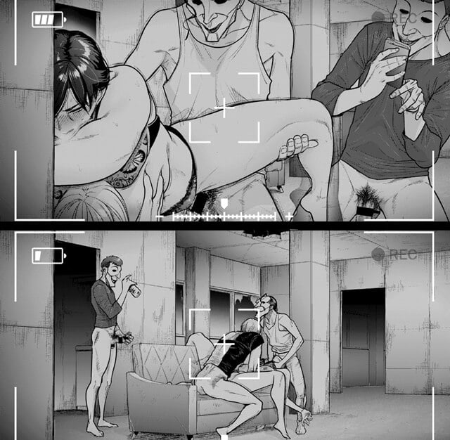 撮影をしながら、代わるがわるチンポをぶち込み精を放つ男たち。女の尊厳も、妻としての貞操も、そんなものは関係なく上の穴にも下の穴にも絶え間なく打ち込まれる男たちのピストン。