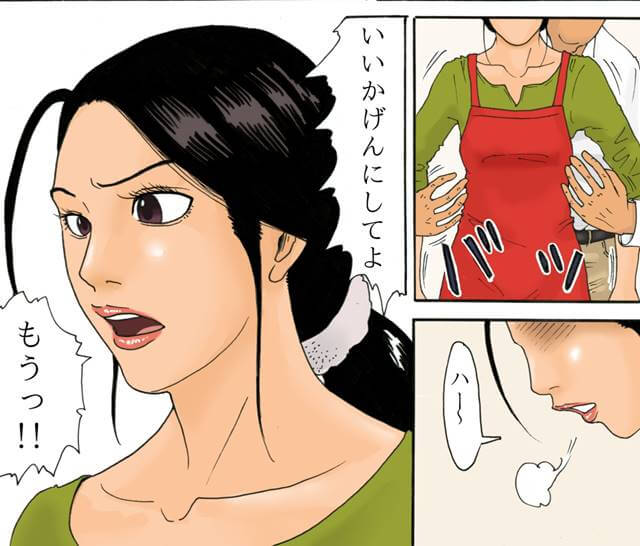 触られて減るもんじゃ無しといわれ、いい加減にしないと警察に通報すると言い出す嫁。しかし夫は、そんなみっともない事はやめてくれと取り合わない。