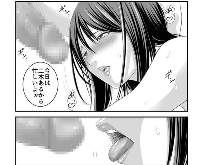 相手する男は二人同時。一人がマンコへ挿入すれば、もう一人が開いた口へとチンポをあてがう。