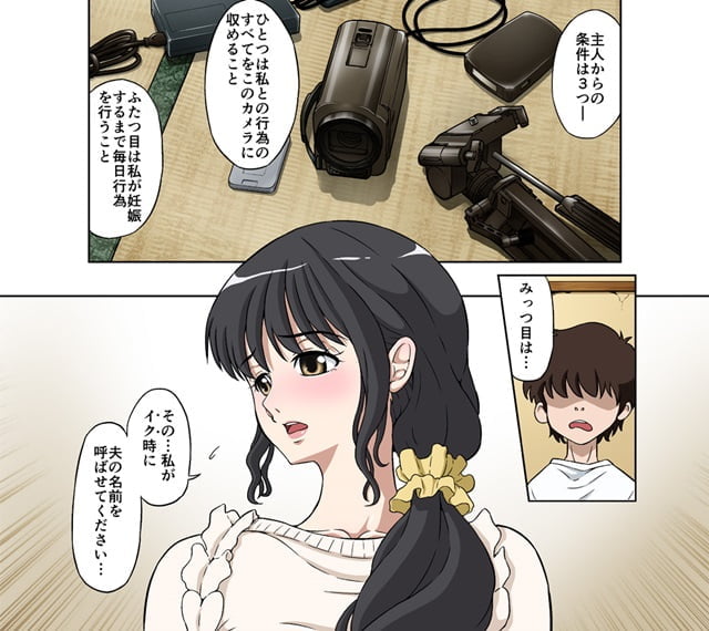 性的不能の夫、しかし子供は諦めたくない。ならば……ということで、妻を妊娠させてほしいと依頼された若者。セックスを撮影すること、妊娠するまで毎日セックスすること、妻が絶頂するときは旦那の名を呼ぶこと、3つの約束と成功報酬で清楚な美人妻と中出しセックスすることになった若者。しかし彼女、じつは年上おやじに開発されたエロボディの持ち主、若者の絶倫デカチンでイカされて夫も知らない本性を暴かれていく。